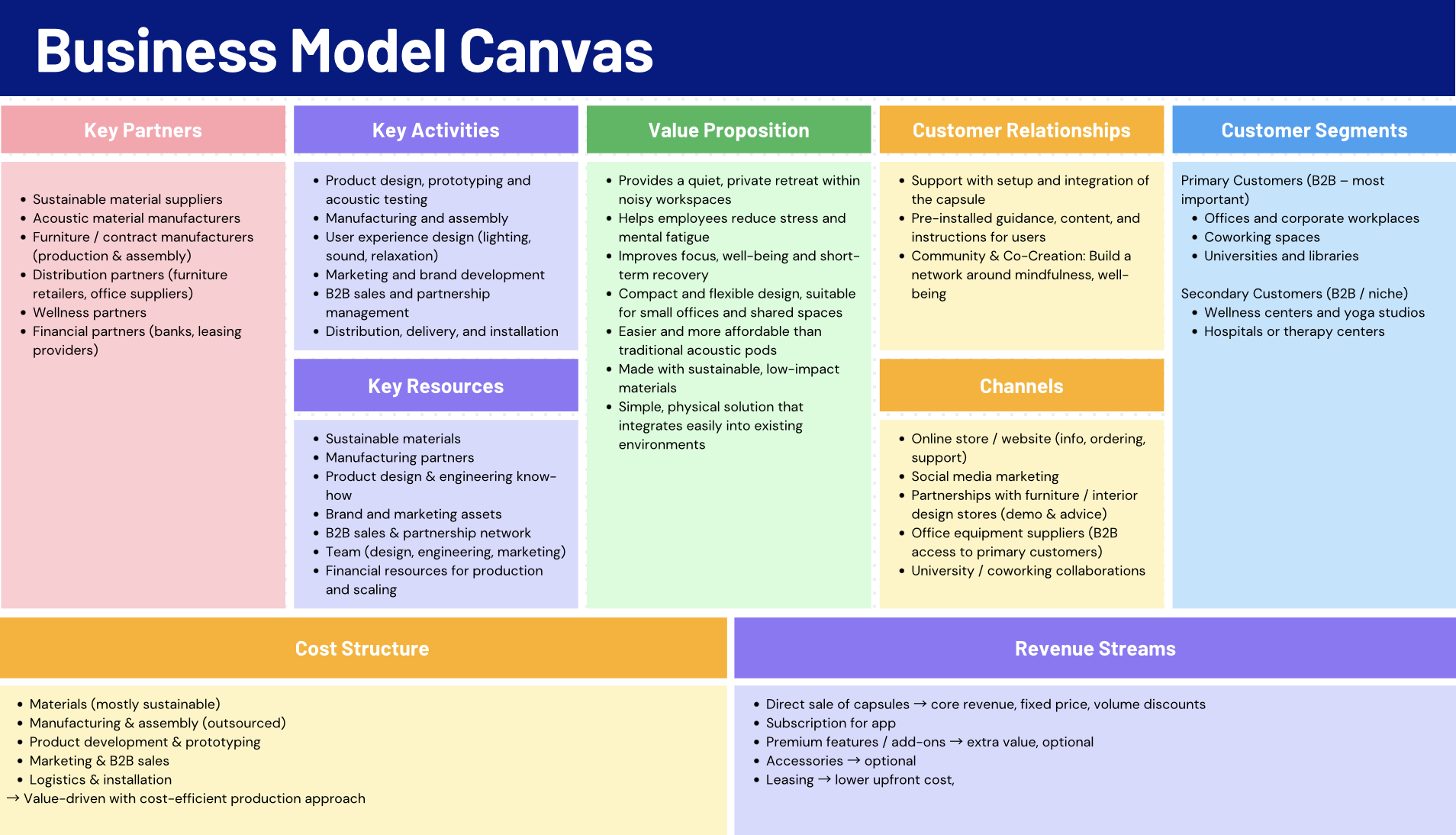 To reach the customers a combination of digital and physical channels is required. A online presence, including a website and social media platforms enables to discover and experience the product as well as communicating and selling. In addition partnerships are needed with furniture retailers, interior design providers and office equipment suppliers which allows a more direct B2B distribution and can help selling the product if the capsule gets recommended by these channels. Collaborations with universities s and co-working spaces can serve as pilot environments where the product can be tested, demonstrated and refined.