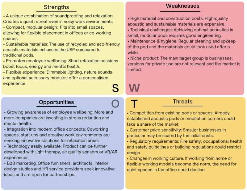 Based on market and competitive analysis, the team decided to develop a compact, soundproof relaxation pod for modern work environments. The product is primarily intended for the B2B market, particularly offices, coworking spaces, and educational institutions, as there is a heightened need for quiet spaces and stress reduction in these settings. The analysis shows that existing solutions are often expensive or less functional. Therefore, the intended solution should meet several requirements, such as guided relaxation exercises, the use of lighting control, or optional sound elements. Furthermore, the use of sustainable materials plays a decisive role in creating a pleasant room atmosphere and meeting European market requirements. As sustainability is such an important factor it will be addressed separately in the next chapter.